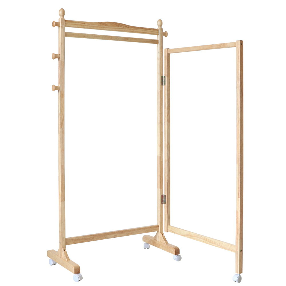 ■商品仕様 材質: 主材:天然木(ラバーウッド材)、キャスター:ポリプロピレン 表面加工:ラッカー塗装 ■商品サイズ(単位:約cm) サイズ: 【折り畳み時】:幅82.5×奥行40×高さ160 【90°に開いた時】:幅82.5×奥行94×高さ160 【180°に開いた時】:幅148.5×奥行40×高さ160cm 【フックサイズ】 上部:(約)3.9×3.9×6.4cm 側部:(約)4×4×4.2cm ■注意事項 お客様組み立て ※画面の設定などによって実際の商品のお色と異なる場合がございますのであらかじめご了承くださいませ。